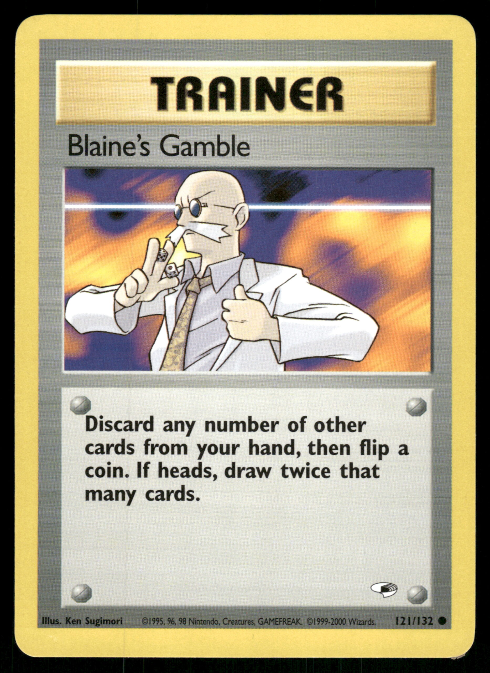 Deze Blaine’s Gamble kaart is nr. 121/132 uit de set Gym Heroes. De kaart is uitgebracht op 14 januari 2000. De artwork is gemaakt door Ken Sugimori. De zeldzaamheid van de kaart is Common.