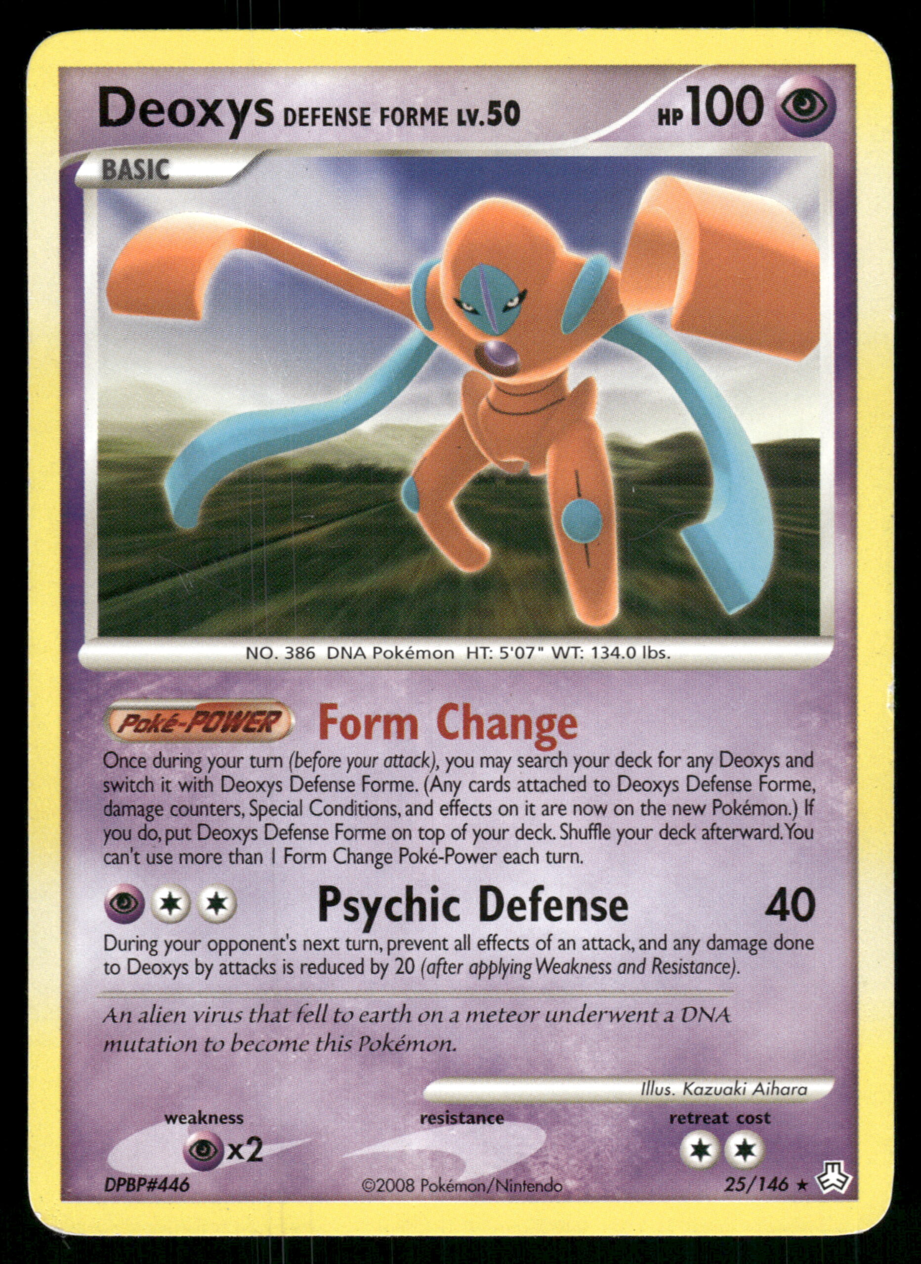 Once during your turn (before your attack), you may search your deck for any Deoxys and switch it with Deoxys Defense Forme. (Any cards attached to Deoxys Defense Forme, damage counters, Special Conditions, and effects on it are now on the new Pokémon.) If you do, put Deoxys Defense Forme on top of your deck. Shuffle your deck afterward. You can’t use more than 1 Form Change Poké-Power each turn.