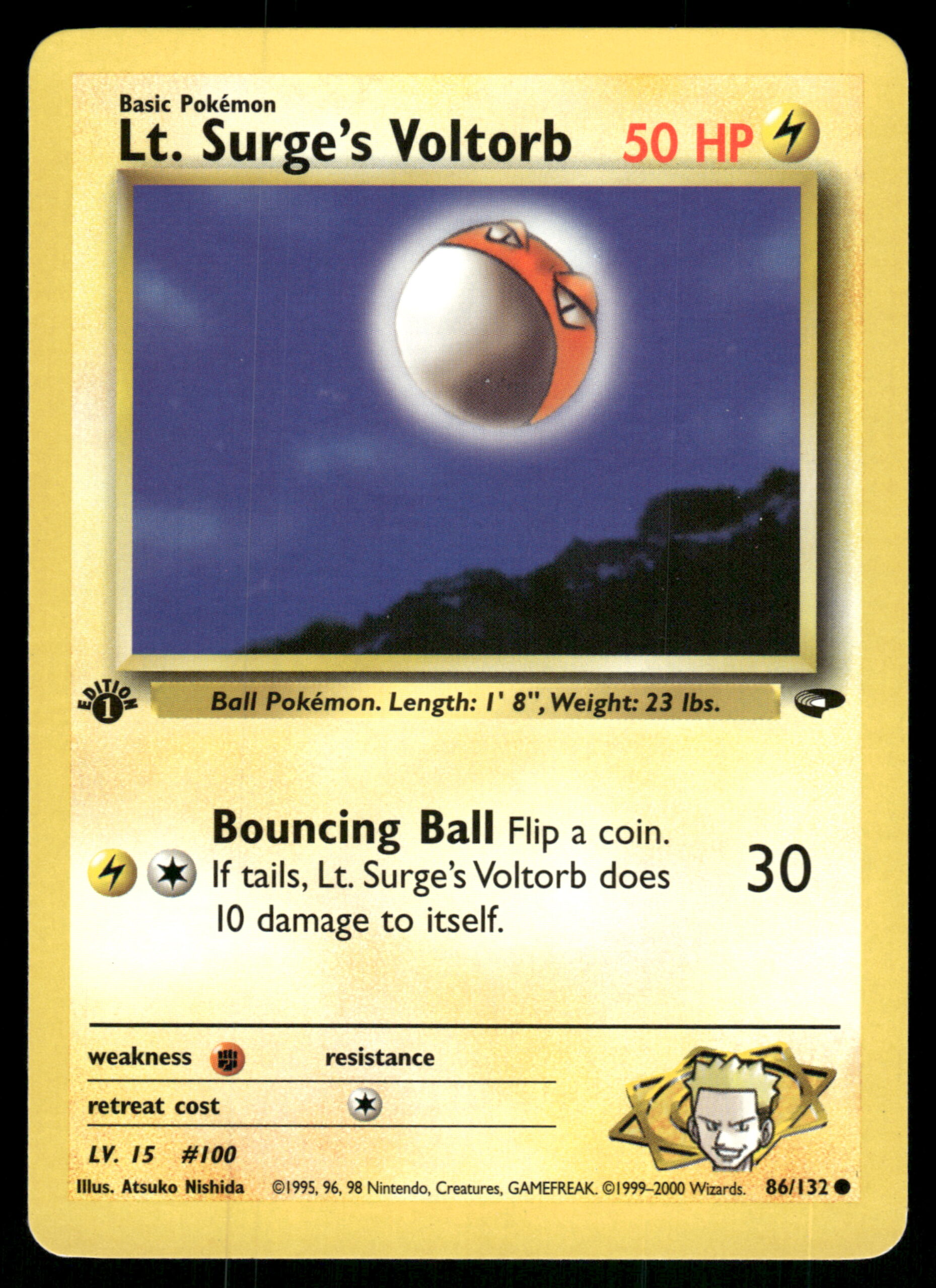 Deze Lt. Surge’s Voltorb kaart is nr. 86/132 uit de set Gym Challenge. De kaart is uitgebracht op 01 januari 2001. De artwork is gemaakt door Atsuko Nishida. De zeldzaamheid van de kaart is Common.